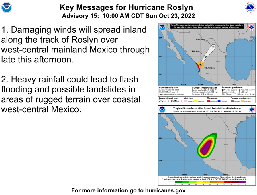 10 hours agoRoslyn a powerful category 3 hurricane was moving across west-central Mexico on Sunday dumping a life-threatening storm surge with damaging winds in its path the US. MEXICO CITY Hurricane Roslyn grew to Category 4 force on Saturday as it headed for a collision with Mexicos Pacific coast likely north of the resort of Puerto Vallarta. Travelers heading to Puerto Vallarta or those already in the area are advised to make alternative plans.